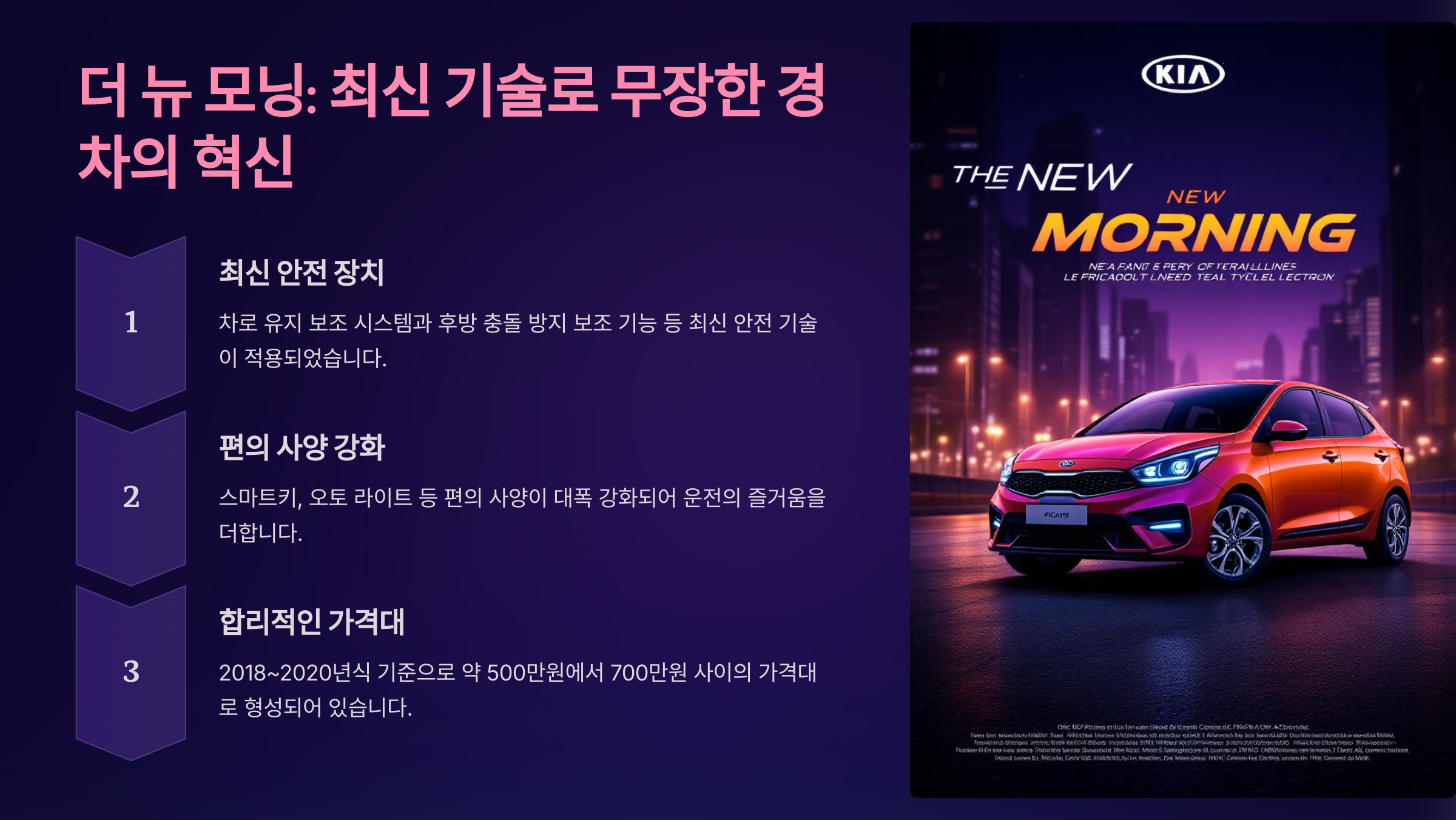 - 최신 모델의 장점: 더 뉴 모닝은 최신 안전 장치와 편의 사양이 적용되어 있습니다. 특히, 차로 유지 보조 시스템과 후방 충돌 방지 보조 기능이 돋보입니다.