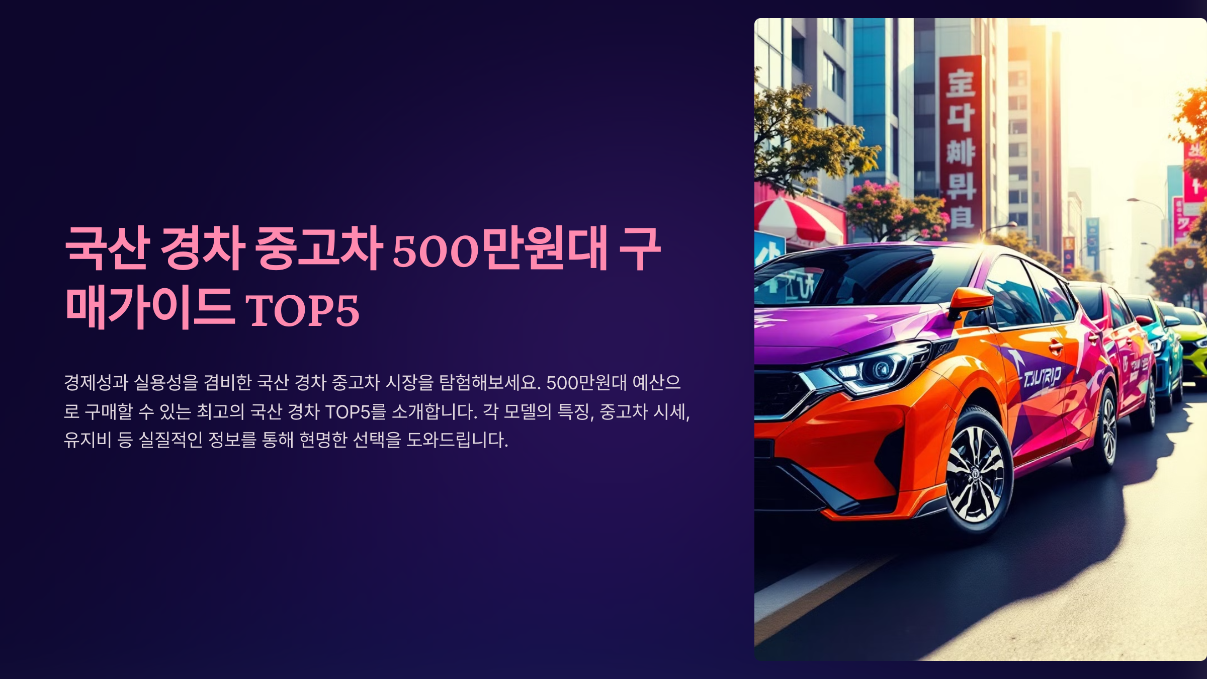 500만원대 예산으로 구매 가능한 국산 경차 중고차 TOP5를 선정했습니다. 각 모델의 특징과 중고차 시세, 유지비 등을 살펴보겠습니다.