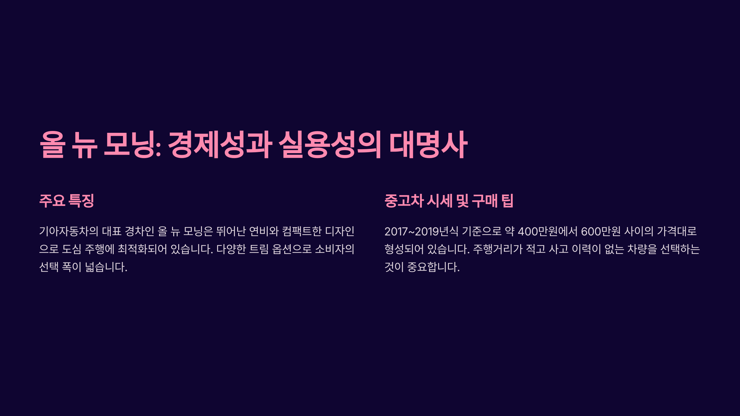 - 주요 특징 및 장점: 올 뉴 모닝은 뛰어난 연비와 컴팩트한 디자인으로 도심 주행에 최적화되어 있습니다. 또한, 다양한 트림 옵션으로 소비자의 선택 폭이 넓습니다.
