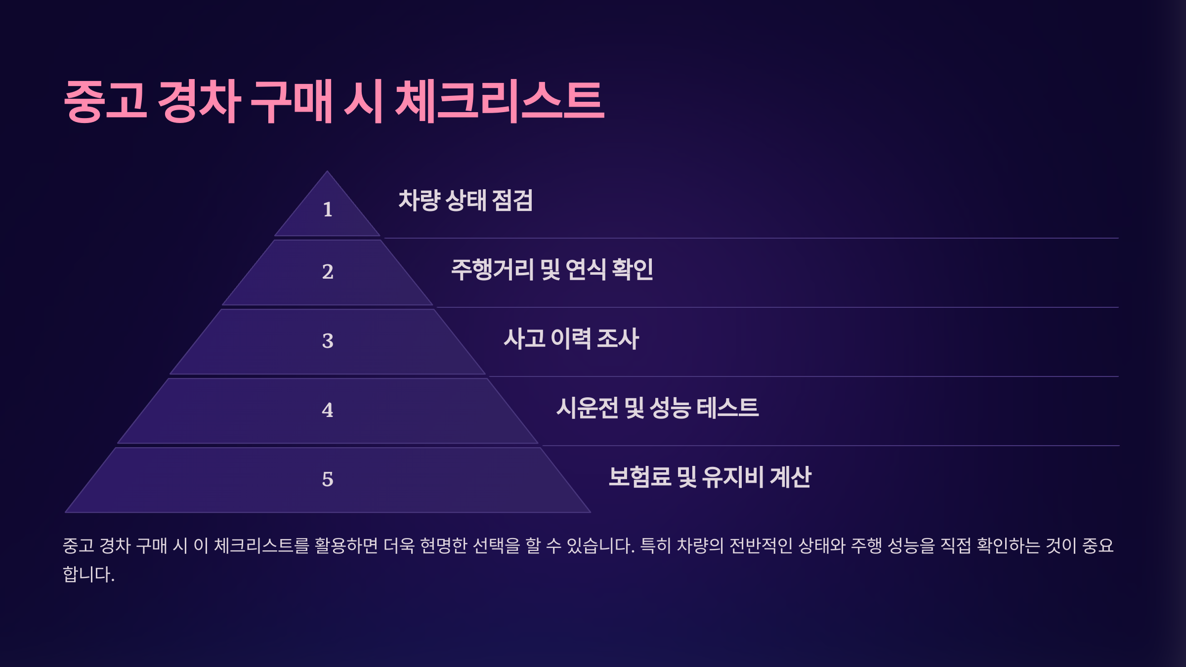 중고 경차를 구매할 때는 다음과 같은 요소를 꼼꼼히 확인해야 합니다.