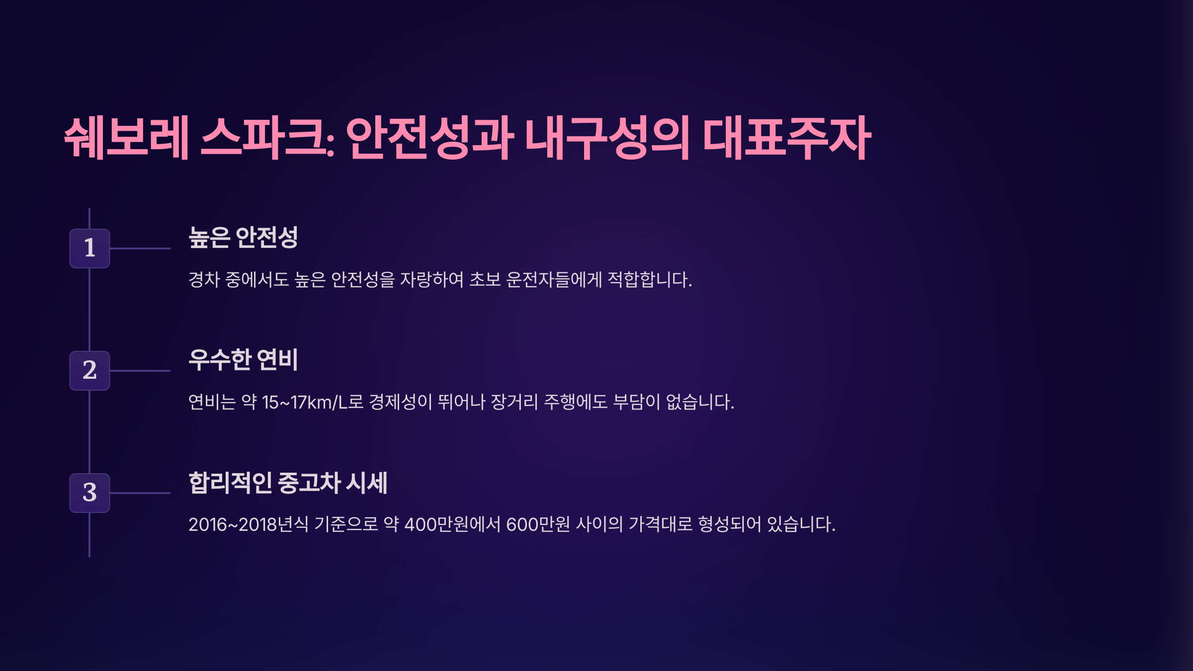 쉐보레 스파크는 안전성과 내구성이 뛰어난 경차로, 특히 젊은 층에게 인기가 많습니다.