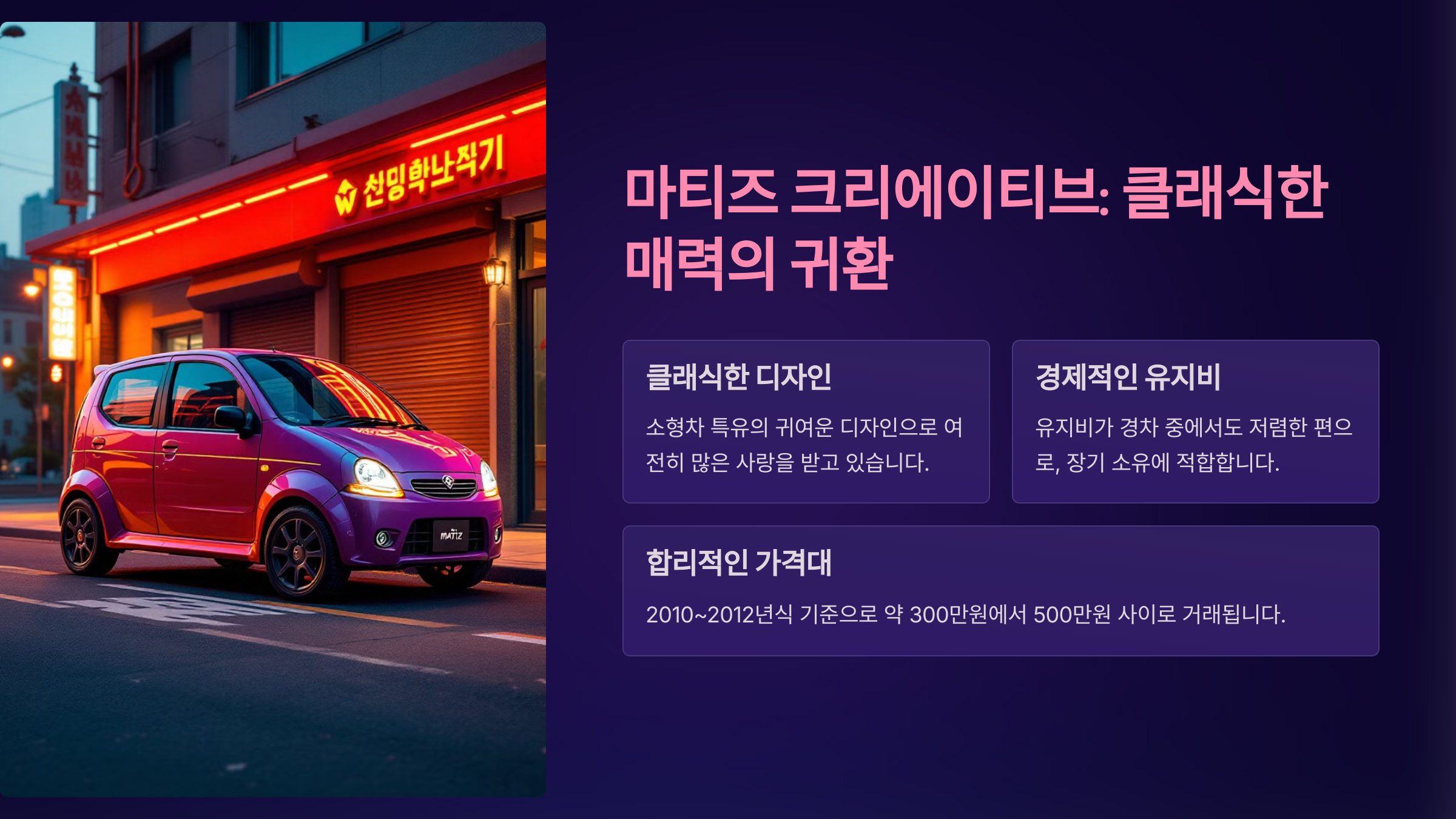 - 클래식한 매력과 경제성: 마티즈 크리에이티브는 소형차 특유의 귀여운 디자인과 뛰어난 연비로 여전히 중고차 시장에서 인기가 많습니다.