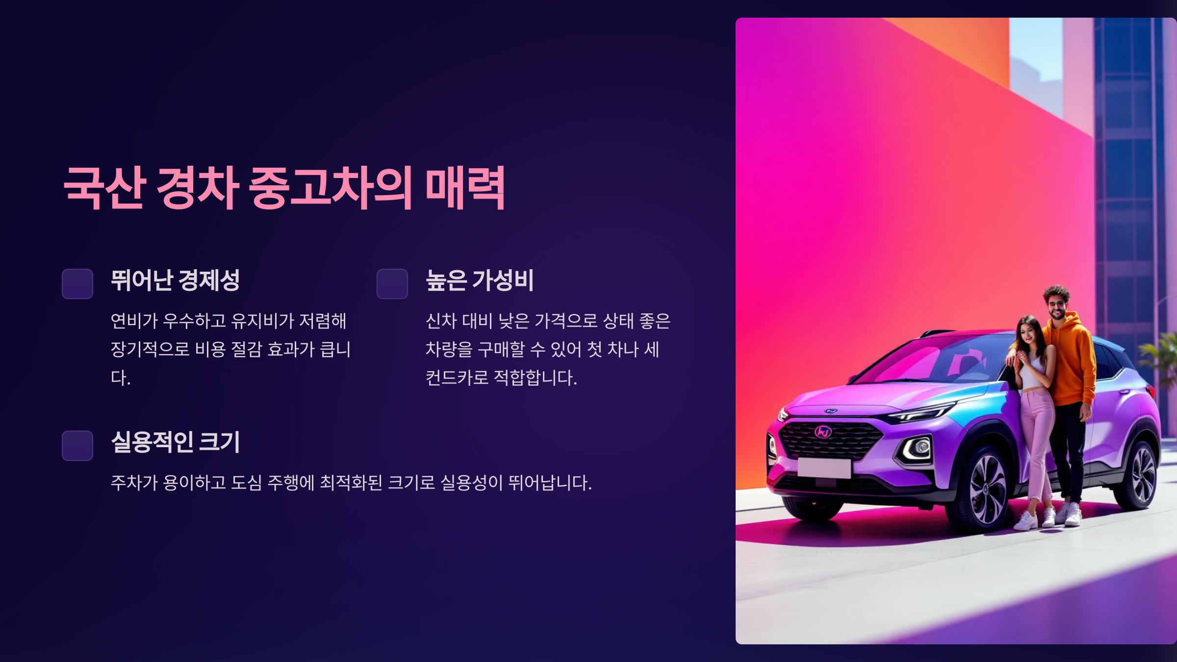 경차는 연비가 뛰어나고 유지비가 저렴해 경제적인 차량으로 손꼽힙니다. 특히 중고 경차는 신차 대비 가격이 낮아 가성비가 뛰어나며, 첫 차로 구매하거나 세컨드카로 활용하기에 적합합니다.