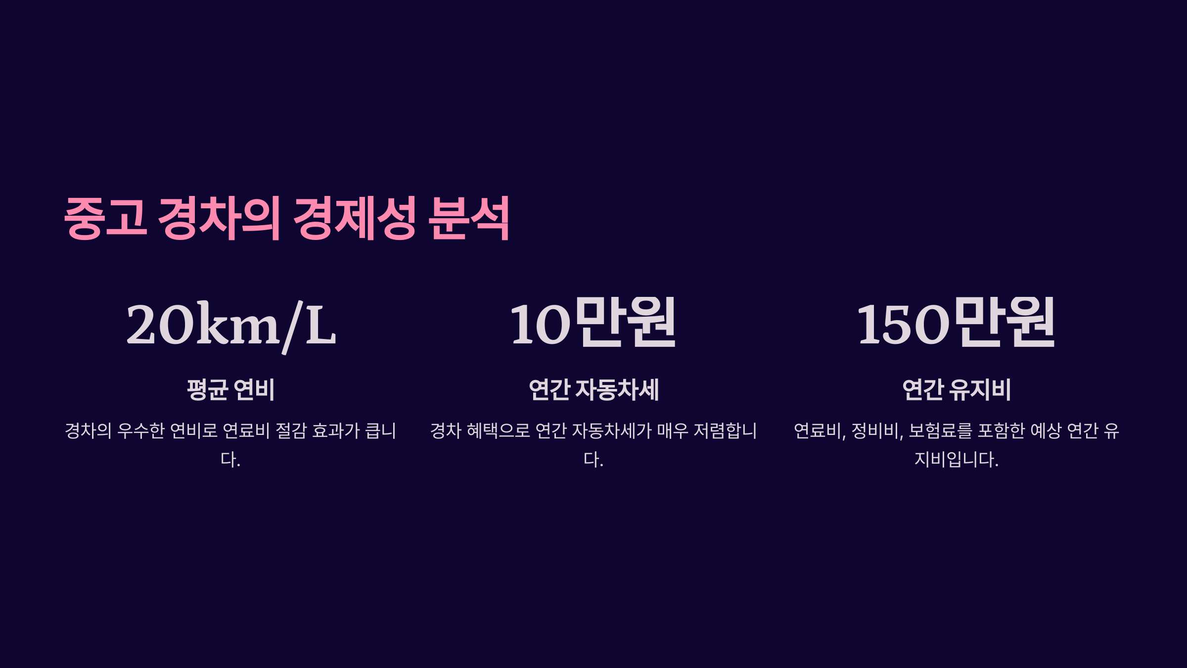 - 보험료와 유지비 계산: 경차는 보험료와 세금이 저렴하지만, 차량 상태에 따라 정비 비용이 추가로 발생할 수 있습니다.