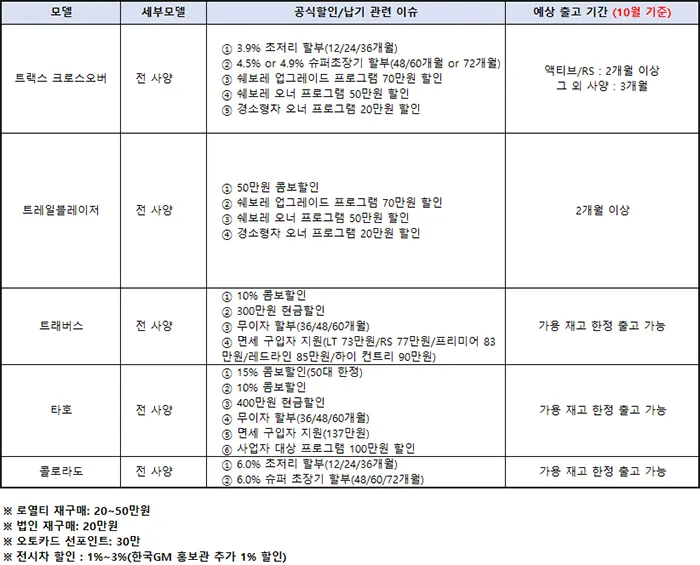 쉐보레는 트레일블레이저 구매 고객에게 콤보 할부 프로그램 50만원 할인 혜택을 제공합니다. 트랙스 크로스오버 또는 트레일블레이저 구매 시 쉐보레 업그레이드 프로그램, 쉐보레 오너 프로그램, 경소형차 오너 프로그램 등을 통해 최대 70만원을 지원받을 수 있습니다. 트래버스, 타호 구매 고객에게는 콤보 할부 선택 시 최대 15% 할인, 일시불 구매 시 최대 400만원 할인 등 다양한 혜택을 제공합니다.