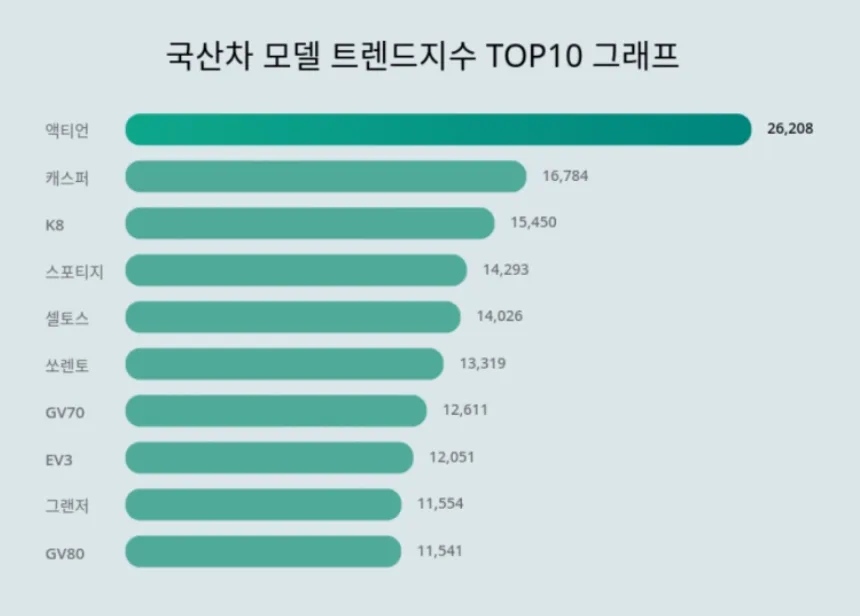 🥇 2024년 8월 4주차 국산차 모델 트렌드 지수 1위는 액티언이 차지했습니다. 신차 출시 효과와 함께 독특한 디자인, 뛰어난 성능 등이 소비자들의 관심을 끌었을 것으로 보입니다.