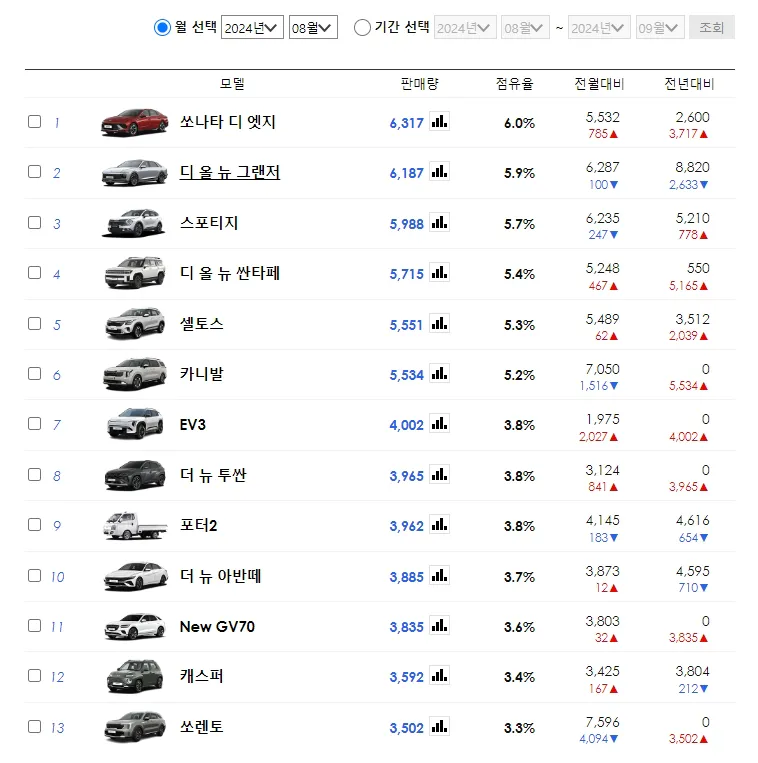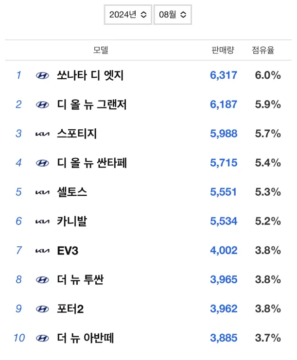 2024년 8월 자동차 판매량 상위 모델 분석