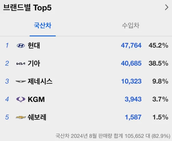 2024년 8월 국산차 브랜드 순위