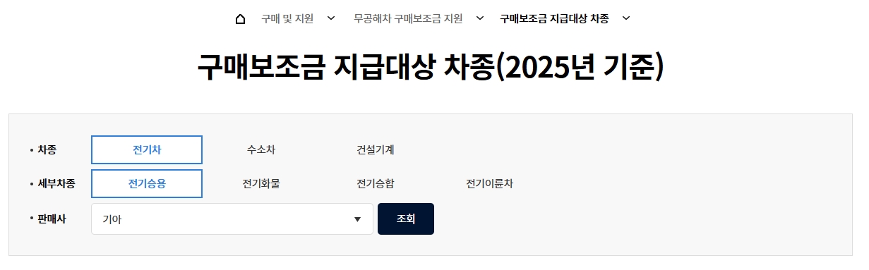 [2] 무공해차 통합누리집 - 구매보조금 지급대상 차종 (https://ev.or.kr/nportal/buySupprt/initSubsidyTargetVehicleAction.do)