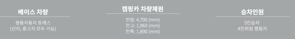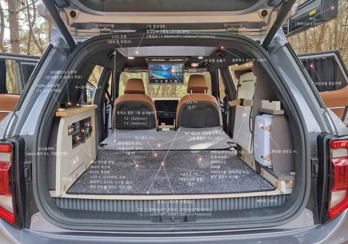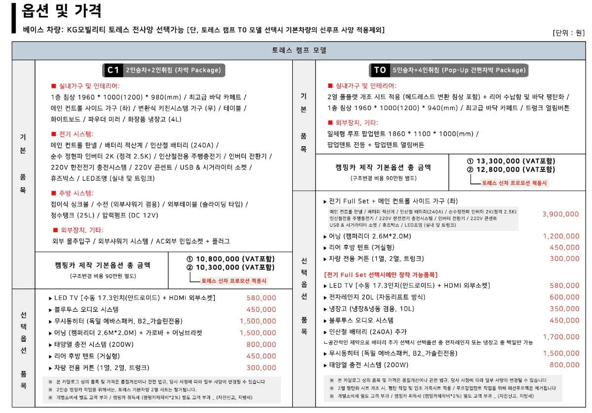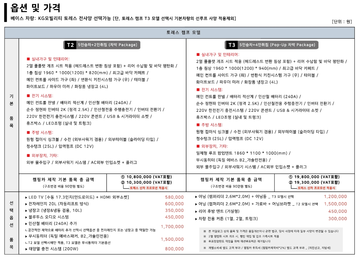 2025년 토레스 캠프 개조 비용의 가격대는 약 1천만 원에서 시작(차량 가격 제외)하는데, 추가 옵션에 따라 가격이 2천만 원까지 달라질 수 있어요. 아래 그림에서 기본 모델과 옵션의 차이를 알아보면 더 좋을 것 같아요.